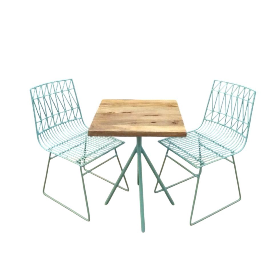 Featuring a fresh aqua blue finish and intricate wireframe chairs